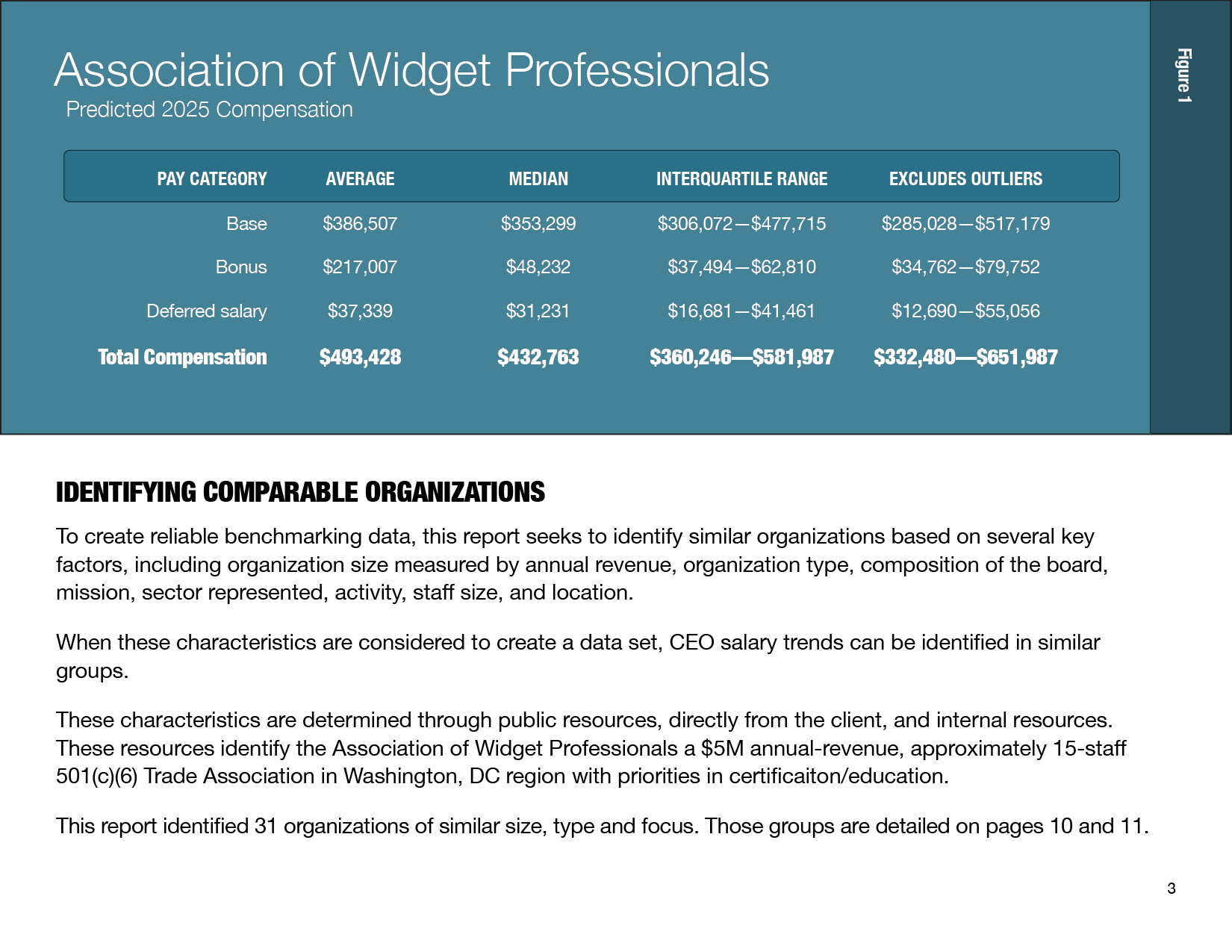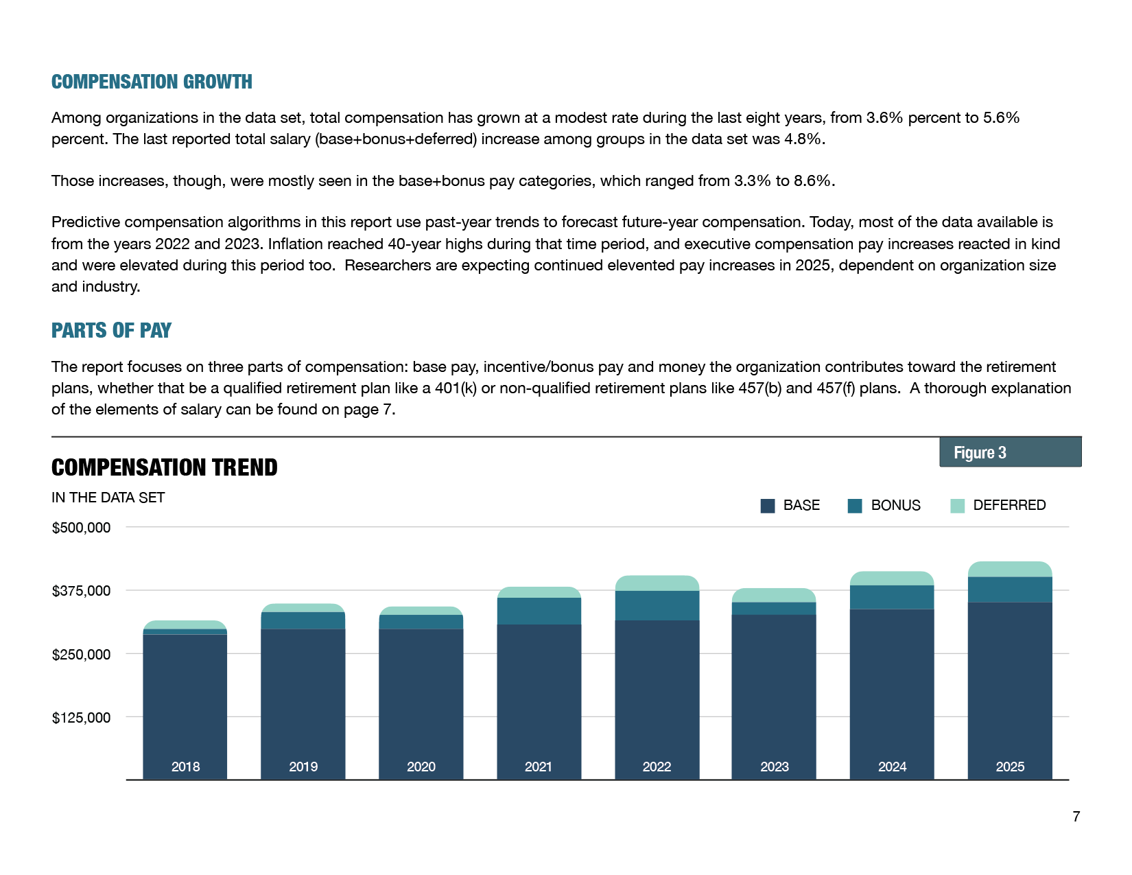 With this 12-page study, organizations receive a complete, detailed view of who peer organizations are and how those executives leading those groups are compensated today, including granular data like base pay, incentive pay trends, and contributions toward deferred compensation plans.